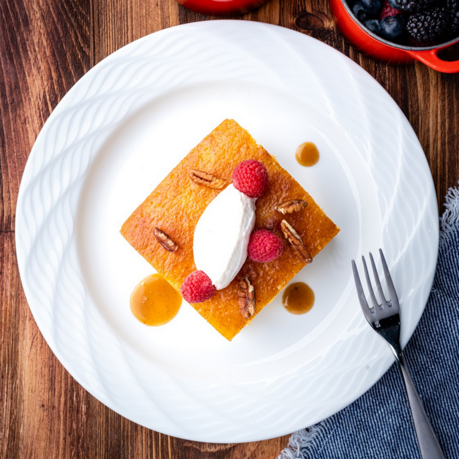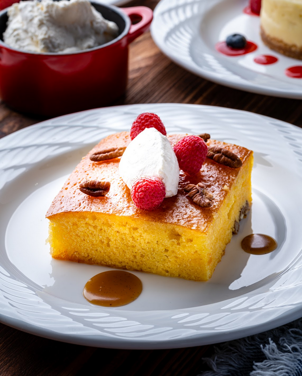 Experience the delightful blend of flavors and textures in our Signature Rum Spiced Pecan Butter Cake. A treat that is sure to please the dessert connoisseurs.